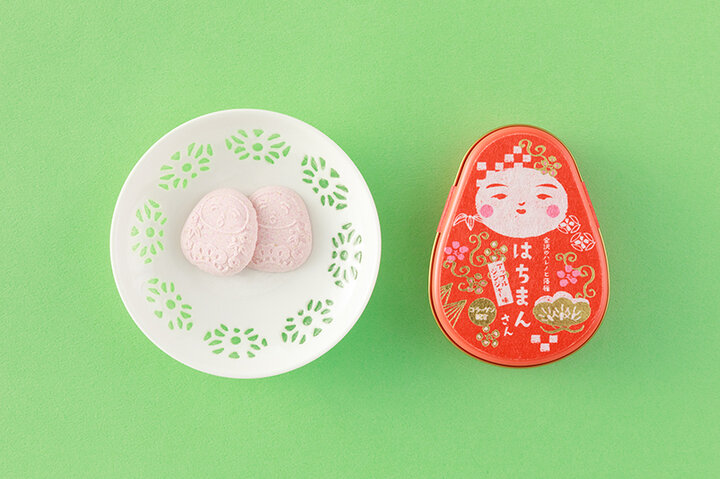 子供の成長と幸せを願い、金沢で古くから作られてきた郷土玩具「加賀八幡起上り」。「はちまんさん」は、その郷土玩具をモチーフにした落雁です。パッケージは加賀藩主前田家の家紋・梅鉢紋や冬の風物詩・雪吊り、金沢の名産品である金箔をイメージした箔押しなど、金沢の美をあしらった和風のデザイン。 従来の落雁よりも甘さやカロリーを抑えている「はちまんさん」。ほんのりとした甘さのアップルジンジャー味で、しゅわっとした口当たりが特徴です。すっきりとした後味なので、あめの代わりにもおすすめです。