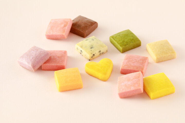 クラフト紙のパッケージを開けると、さまざまな色合いの四角やハート型のクッキーが目に飛び込んでくる「たべられるモザイクタイル」。 こちらは「モザイクタイルミュージアム」で注目された、岐阜県多治見市笠原町にある老舗和菓子店「陶勝軒」が手掛ける「たべられるモザイクタイル」シリーズのひとつ。モザイクタイルの「美しくてかわいらしい世界を感じてもらいたい」との思いで、「陶勝軒」3代目のご主人が町の応援菓として開発しました。 遊び心あふれるクッキーは、モザイクタイルのように好きなカタチに並べてみるだけでもワクワク♪ 子どもから大人まで、手にした人を笑顔に導いてくれます。