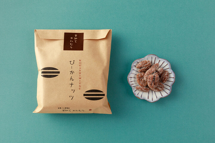金沢三茶屋街のひとつ、にし茶屋街で芸妓さんより「茶屋街のおもたせ」として人気を集める甘納豆屋さん「かわむら」。 そんな地道で丁寧に行われる甘納豆の製法を応用したのが「ぴーかんナッツ」。くるみよりもえぐみが少なく、濃厚なまろやかさが特徴のピーカンナッツをオーブンで焼き、秘伝の蜜を煮詰めて、オーガニックシュガーをまぶしていきます。サクサクした食感が心地よく、自然な甘みがナッツ本来の香ばしさを引き立てます。