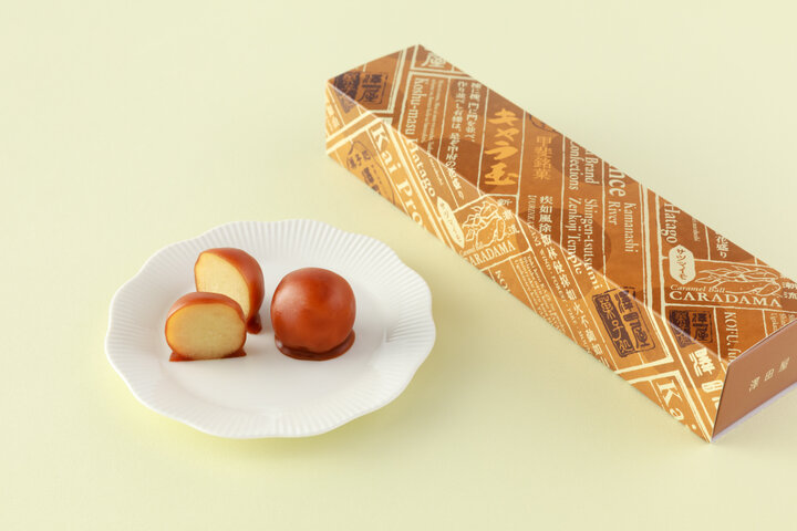キャラメルの羊羹でサツマイモの餡を包んだ和菓子「キャラ玉」。サツマイモの甘みと自家製キャラメルの2種類の甘さが重なり、日本茶はもちろんのことコーヒーやカフェラテともよくあいます。 さつまいもだけで作る餡は山梨県北杜市明野町のブランド野菜「あけの金時」を半分使用し、餡を包むのはバニラビーンズを加えた香り豊かなキャラメルの羊羹です。