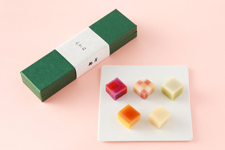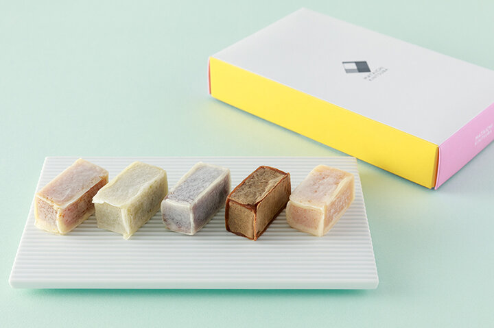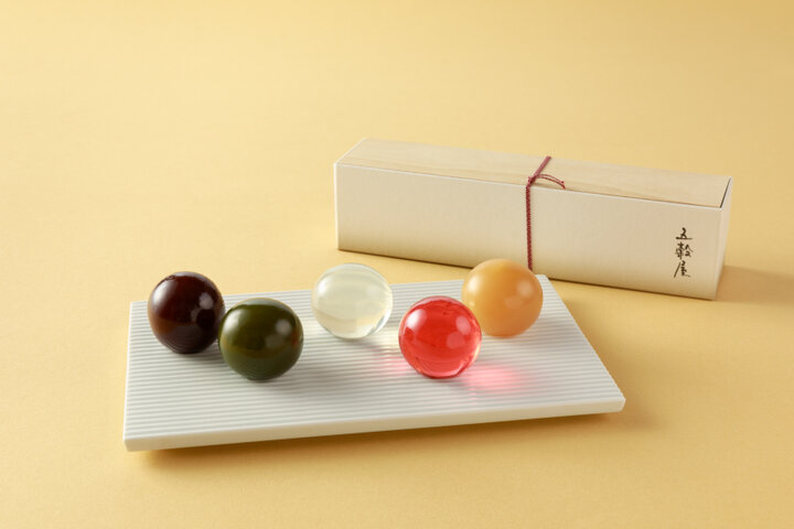 シンプルでスタイリッシュな箱を開けると、きらめきをまとった、カラフルで愛らしい形の5種の玉羊羹がお目見え。5色は「春夏秋冬」と、季節の移り変わりを指す「土用」を表現。日本ならではの美しさを表した個性的な和の色合いに心ときめきます。 気になる味わいは、フルーティーな香りとスッキリとした甘さの「りんご酢」(赤)、自家製のこし餡に醤油糀を練り込んだ「醤油糀」(茶)のほか、酒(透明)、抹茶塩糀(緑)、白味噌(薄黄)の5種。発酵のさしすせそ(酒、塩糀、酢、醤油、味噌)を用いた、職人のこだわりが詰まったやさしい味わいです。