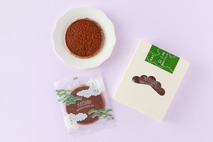 真っ白な箱に、松の形が目を引くパッケージの「キャラメル煎餅 まつほ」。「まつほ」は、百人一首にも挙げられた藤原定家の和歌「来ぬ人をまつほの浦の夕凪に焼くや藻塩の身もこがれつつ」が由来。 バリッ!とお煎餅を割ると、キャラメルの甘い香りが放たれます。噛みしめると、焦がしキャラメルのほろ苦さ、舌に触れる塩気、追いかけてくるお味噌の風味がベストマッチ。複雑な味わいが絶妙なバランスで仕上げられています。