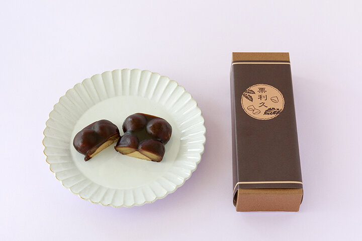 ほくほくした食感がたまらない栗ならではのおいしさがぎゅっと詰まった「栗利久」。チョコレートケーキのような見た目ですが、栗あんと渋皮煮を黒糖羊羹で包み込んだ和菓子です。黒糖ならではの深みのある甘さの羊羹と、栗独特のほろっとした2種類の口当たりが上品な味わい。 3つの層をきれいに出すコツは、ぽこっと山になった部分を切り分けること。断面の見た目も美しく、濃い緑茶やほうじ茶、コーヒーともマッチする味わいは贈り物にもぴったりです。