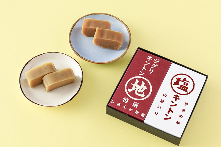 高知県西部を流れる自然豊かな四万十川周辺は山の恵みも豊富。なかでも大きな粒と高い糖度を誇る「しまんと地栗」は、旬の時期に現地で味わいたい隠れた名物。 そんな地栗のおいしさをぎゅっと固めたのが、「紅白キントン」です。「ジグリキントン」は、栗の実をそのまま食べたと思うほど、栗の風味を濃厚に感じます。最小限の材料で作ることで、栗の味わいが最大限に引き立つそう。「塩キントン」も同様に濃厚で、国産和栗の甘みを少しの塩がより引き立ててくれています。