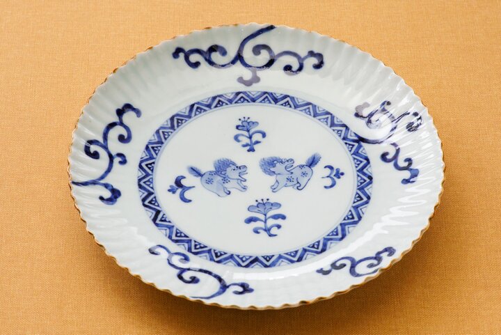 染付びっくり獅子文皿7700円。唐草模様を配したお皿の中心には、驚いた様子の2頭の獅子。思わず見入ってしまう絵柄