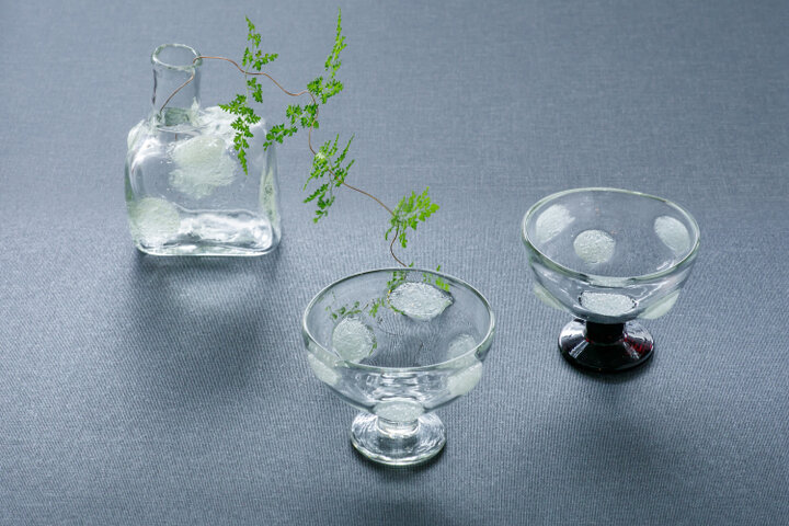 泡水玉変形花器4400円(左)。泡水玉デザートカップ各4840円(中・右)は、高台の色違いで2種類がある