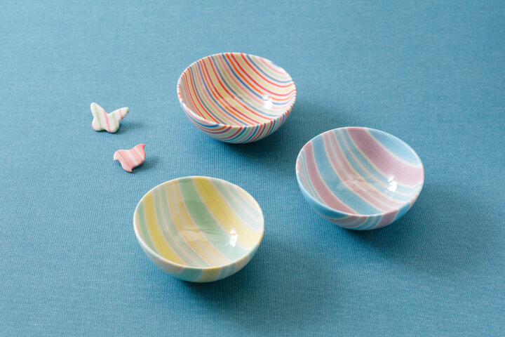 “練り込み”という技法を用いてうつわやアクセサリーを制作する、佐藤愛子さん。異なる色の土を重ね合わせて、ストライプや幾何学模様などを表現しています。一つひとつ違う配色や曲線で彩られたうつわは、暮らしのなかで楽しいリズムを刻んでくれそう。アイテムによって土や釉薬を使い分けているので、ツヤやマットなど質感の違いも楽しめます。