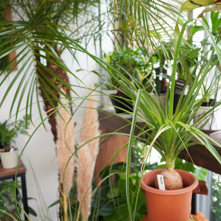 湘南という土地柄もあって、ビーチリゾートで見かける大きなフェニックスやモンステラ、ヤシなど海辺の家にあいそうな観葉植物が種類豊富です。その一方で小さなプミラやシダ類をセンスよく寄せ植えした壁掛けやハンキングなど、家に飾りたくなるような植物は見ているだけでも楽しくなります。