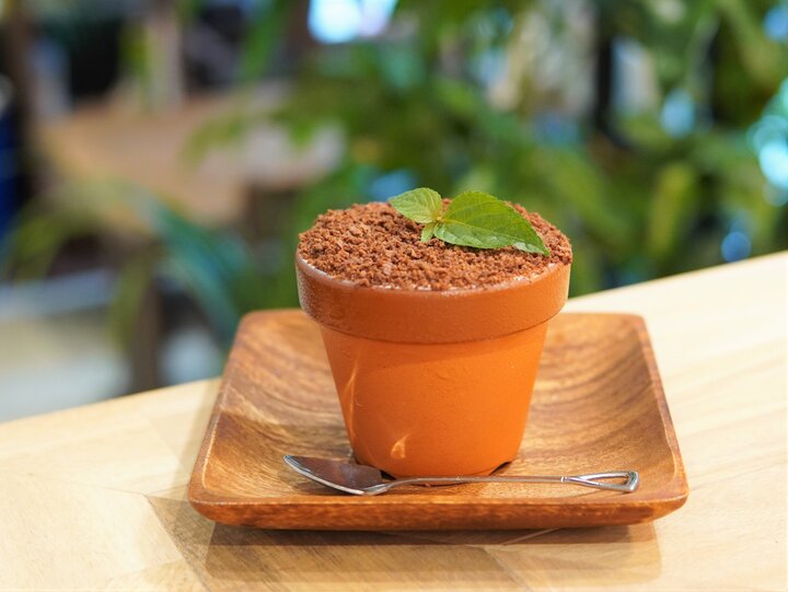 ランチタイムにはキーマカレーやフレンチトーストなど手づくりの料理がいただけるほか、観葉植物のお店らしい素焼きの3号サイズの鉢に入ったパフェが人気です。 チョコレートクランチを敷き詰めた上にミントの葉を添えた「ティラミスパフェ」は初めて訪れる人のほとんどが注文するという本物の鉢植えのようなパフェ。チョコレートクランチの下にはバニラアイスとコーヒーゼリー、マスカルポーネチーズ、スポンジケーキなどが層をつくる本格的なスイーツです。