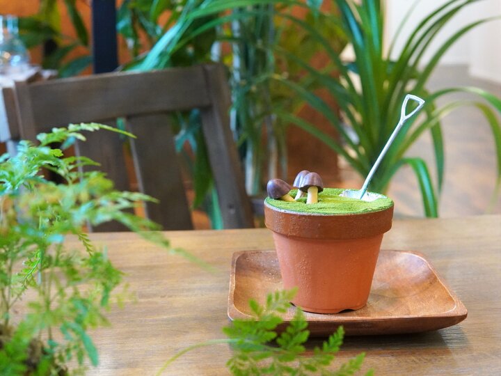 テーブルに置くと本物の鉢植えと同化する「抹茶パフェ」(900円)