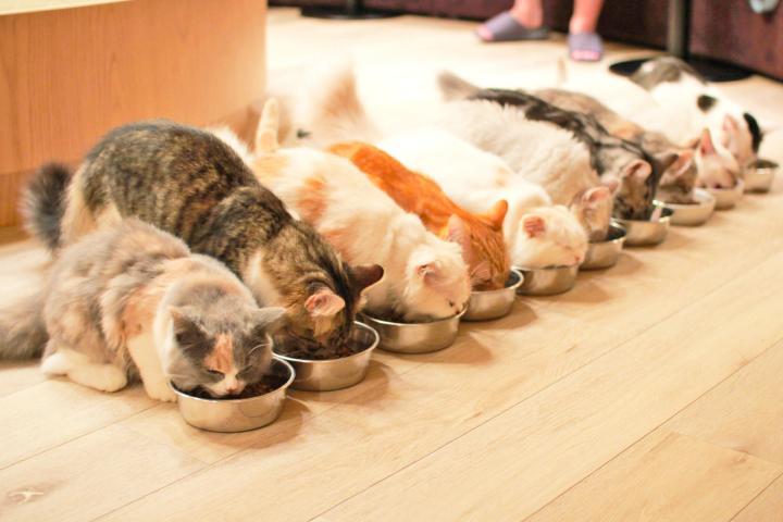 一列揃ってのもぐもぐタイムに癒される♪ 渋谷の「猫カフェMoCHA」