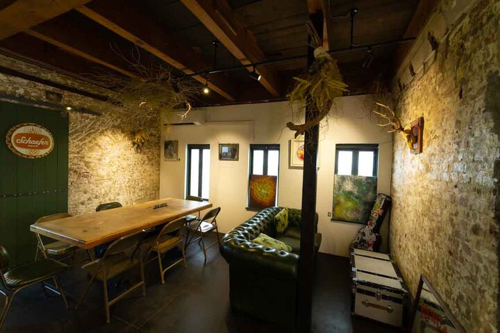 客席もアメリカンヴィンテージの家具で統一。デザインが異なるテーブルや椅子がセンスよく配され、どこの席に座るか迷ってしまいそう。大きな革張りのソファの前には、大きなスーツケースを置いてテーブル代わりに。ヨーロピアンな外観と、アメリカンな内装のギャップがユニークです。 歴史ある建物ですが、築年数や何のために建てられたかは不明。実は客席の床には地下室へと続く階段が隠れているとか。どんな目的で建てられたのか、想像してみるとワクワクします。