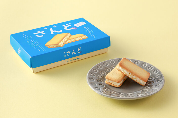 くもりのないブルーが目を引くパッケージのサンドクッキー「雪塩さんど」。「雪塩」とは、製塩するときに水分を一気に蒸発させてパウダータイプに仕上げた塩のネーミングです。できあがった塩が、さらさらしていて雪のように見えることから名づけられました。 クッキーにサンドされているホワイトチョコは、生地に気泡が入っているエアチョコ仕上げ。ふわっと溶ける口当たりが特徴です。ホワイトチョコの甘さの中に見え隠れするほのかな塩の風味と、サンドしているビスケットのあっさり軽やかな口当たりがマッチしています。