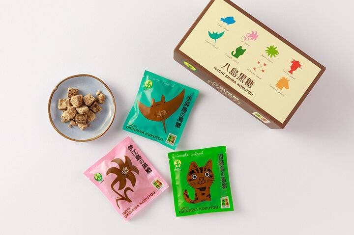 カラフルなパッケージに、チョコのような色で描かれたポップな動植物のモチーフ。「八島黒糖」は、沖縄の8つの島で作られたサトウキビをそれぞれ、生産地域にある工場で煮詰めて作ったブランド黒糖のセットです。 それぞれの島で育まれたさとうきびから作るため、味、香り、食感に色まで、シングルオリジンのスペシャルティコーヒーのように個性豊かです。例えば、宮古島と石垣島のあいだに浮かぶ多良間島の黒糖は四角形で固め。味わいがギュッと詰まったような濃厚さです。