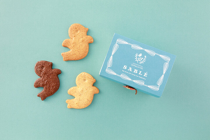 優しいブルーと白のツートーンカラーが爽やかな外箱は、留め口が玉ひも仕様になっています。玉ひもをほどいて包みを開けるときは、思わずワクワクしてきますよ。 プレーンとショコラ、メイプルが各2枚ずつ。合計6枚のかわいらしいとりたちです。とりサブレの生地は、フルーツタルト専門店[oHacorté]自慢のさくさくした食感のタルト生地をそのまま使っています。丁寧に焼きあげられたサブレはさっくりと軽い口あたりで、優しい甘さが口の中に広がります。