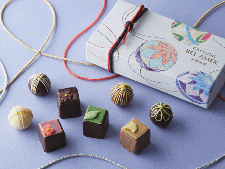 「彩ショコラ」は、幅広い世代に楽しんでほしいという思いから、和紅茶や自家製キャラメルなど、多くの人に馴染みのある素材を使用しています。 四角い形のショコラにはガナッシュやプラリネを入れ、岡山県産の和紅茶と、りんごや塩、国産苺ピューレ、国産柚子ピューレなどの素材を合わせ、トップにはキラキラと輝くデコレーションが施されています。 毬をイメージした丸型のショコラには自家製のキャラメルを入れ、きなこ、抹茶、金ごま、甘酒などの和の素材を合わせています。 毬の柄をイメージしたラインは、ひとつひとつ手作業で仕上げるこだわりのショコラです。