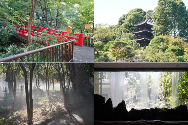 (左上)赤い欄干の弁慶橋(右上)庭園のシンボル三重塔(左下)一日のうち何回かはミスト状の霧が出て雲海のような幻想的な風景が見られる(右下)滝のトンネルと呼ばれる裏側からも見学するとより迫力を感じられる五丈滝