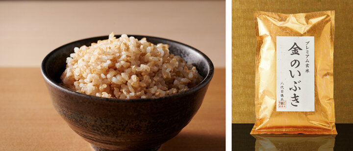 「金のいぶき」は、その名の如く黄金に輝く、玄米の常識を覆すプレミアム玄米。栄養を豊富に蓄えた胚芽の部分は通常の玄米よりも3倍大きく、ビタミンEやGABAが多く含まれています。鼻に抜ける黒糖のように柔らかく甘い香り、プチプチと口のなかで踊るような粒感で、噛みしめるたびに増していく濃厚な味わいです。 八代目儀兵衛のお米マイスターが厳選吟味したそれぞれのお米の持ち味を生かし、ホテルシェフがオリジナリティを添えてバリエーション豊かに仕上げています。