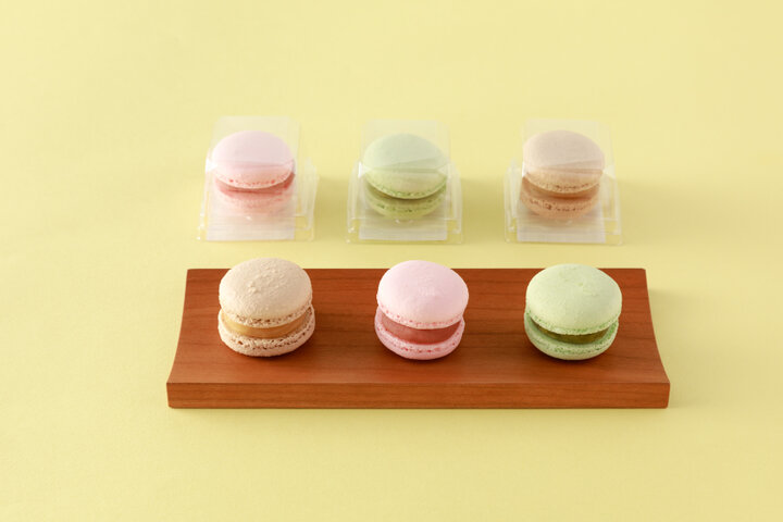 ころんとしたフォルムにパステルカラーが目を引く「あんまかろん」。フレンチメレンゲを使ったマカロンに、きれいな色合いのあんこが挟まれています。フレーバーは抹茶、塩キャラメル、苺の3種類です。 あんこの水分がマカロンに移ってしまうことに防ぐため、あんこをフィルムに包んだ状態で販売されています。食べる際にフィルムを外してマカロンと合わせることで、サクッとした軽い食感の生地と、みずみずしいあんこを存分に味わうことができます。