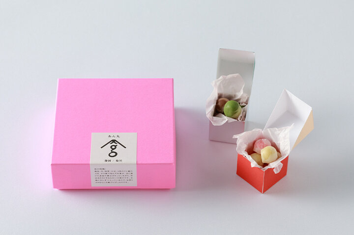 モダンな幾何学模様を描くパッケージが目を惹く「あん丸」は和菓子の伝統的モチーフ、松林に自生する丸いきのこの一種、松露(しょうろ)を模した松露菓子です。 薄紅色と白色の白餡、抹茶餡、小豆の4色のこし餡をひと口サイズに丸め、すり蜜でコーティング。口に入れると、しっとりしたやわらかな食感と上品な甘さが広がります。