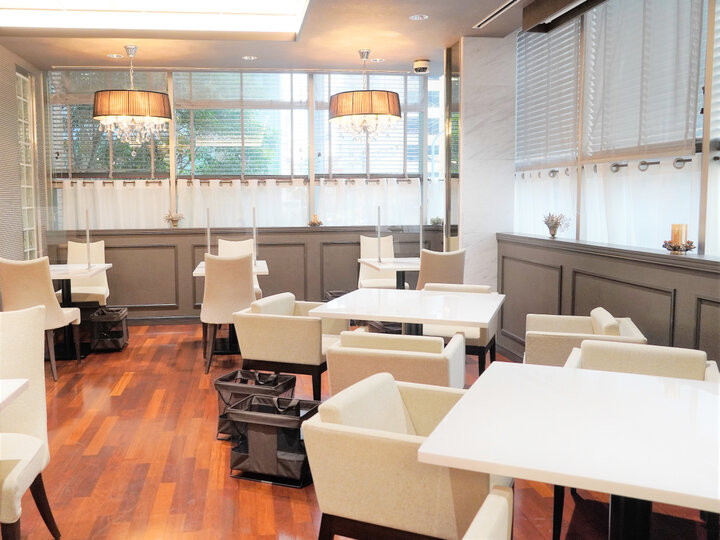 モンブランをテーマにした2階のカフェ「ル・モンブラン・カフェ」。白で統一したテーブルとイスに、カフェカーテンを通してやわらかい光が届く明るいカフェです。モンブランの アシェットデセールのほか、1階で焼くパンを使ったランチやショーケースのスイーツをいただきながらゆったりと過ごせます。