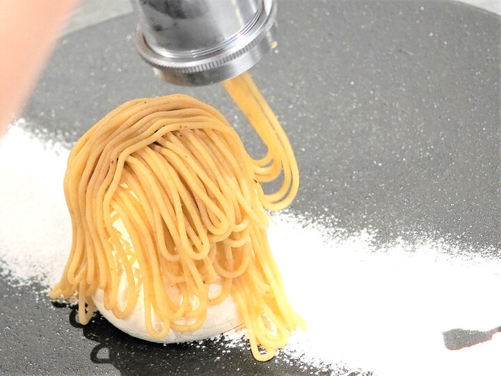 手際よくしぼる和栗を使った新鮮なモンブラン