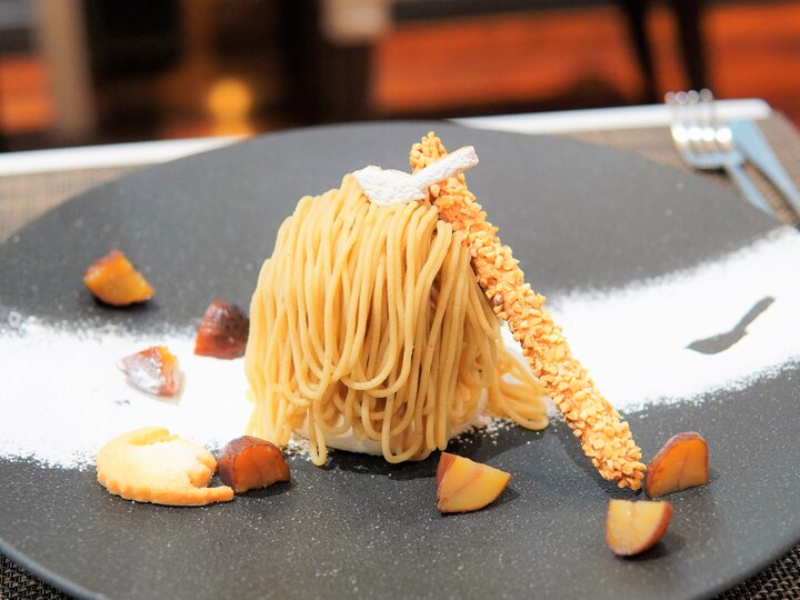 このカフェの看板商品はしぼりたてモンブランの美味しさがたっぷりと味わえるデセールです。繊細なマロンベーストは乾燥しやすいため、しぼりたてがそのおいしさを一番堪能できるのだそう。オーダーごとに厨房でパティシエがしぼりるマロンペーストは新鮮でほんわかとしたやわらかい口あたりです。