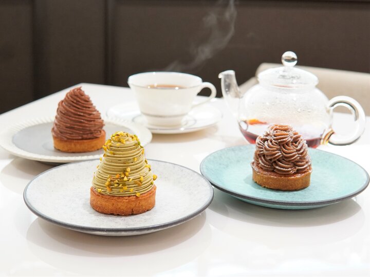 ケーキ左から「ショコラモンブラン」(550円)「ピスタチオモンブラン」(836円)「ル・モンブラン」(693円)「ハーブティー」(550円)