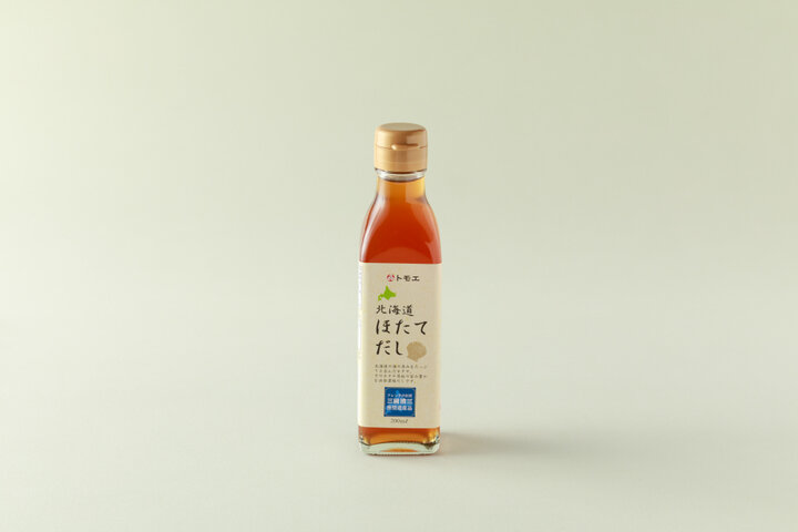 ふわっと上品な香りの漂う、ホタテのうまみが詰まった液体タイプのだし。いつもの料理に取り入れると風味が豊かになります。炊き込みごはん、中華スープや炒めもの、パスタの味付けなど、和洋中のジャンルを超えて台所で活躍します。冬は鍋料理に使うのもいいですね。 “トモエ印”が目印の福山醸造は、北海道産素材を活かしたモノづくりの技術を持つ1891(明治24)年の創業の加工品メーカー。こちらのだしは、北海道産のホタテ貝柱を100%使って凝縮したホタテエキスを使用しています。北海道の海の恵みをたっぷり含んだ豊かな風味を食卓でじっくり味わいましょう。