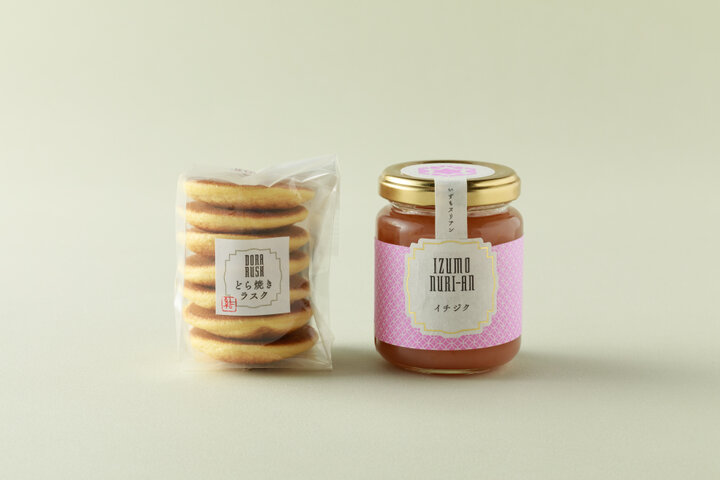 白あんのコクのある甘さにフルーティーな多岐イチジクを加えたペースト状のあんこ「出雲ヌリアン」。なめらかな口当たりにプチプチしたイチジクの食感がアクセントです。パンに塗ったり、ビスケットにのせたりと、自家製のあんこスイーツを楽しめます。 ぜんざい発祥の地・出雲で、明治5年に創業した老舗和菓子店「坂根屋」。和菓子に使う技術であんを練り上げ、出雲産のフルーツや食材と合わせて作っているのが「出雲ヌリアン」。多岐イチジクのほかに出雲生姜など全7シリーズあります。どら焼きの皮をそのままラスクにした、サクッとした歯触りの「どらやきラスク」との相性もばつぐん。いろんな食べ方を探してみましょう。