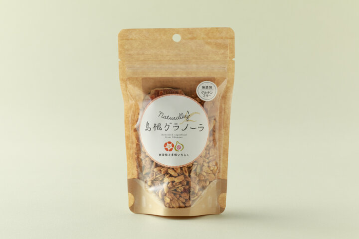 島根県産の玄米をパフ状にした軽い食感のパフに、細かく切ったコクのある柿にドライイチジクが彩りになったグラノーラ。ほのかな黒砂糖の風味でそのまま食べてもおいしく、ヨーグルトやアイスクリームに加えてもヘルシーに楽しめます。 島根県産の牛乳や果物など地元素材でクラフトアイスクリームを作る「LoTa森田屋」のグラノーラは、店主の実家が柿農家であることから干し柿を活かして作り始めたのだそう。アイスクリームと同様に、グラノーラも島根素材をふんだんに使用。おやつに食事にと、さまざまなアレンジが広がります。