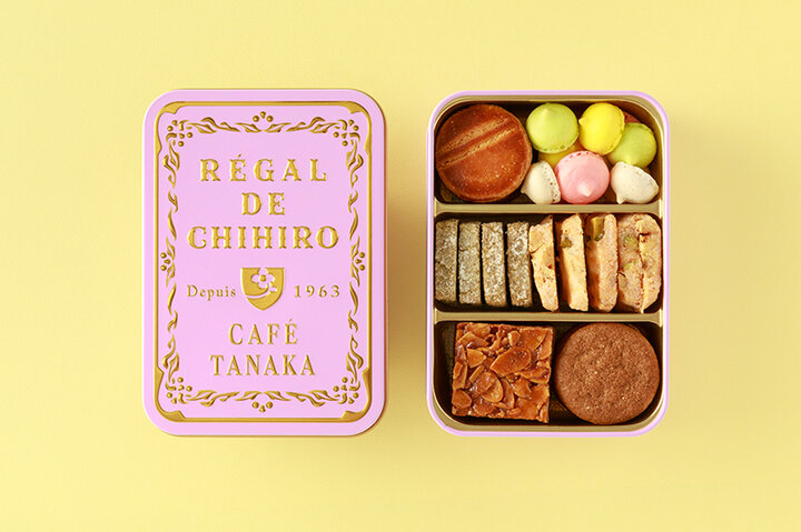 ラベンダー色の缶にアンティークゴールドのレリーフ。クリーム色のリボンをするっと解いてふたを開くと甘い香りが広がり、端正なかたちのクッキーが顔を見せます。 クラシックで上品なときめきに満ちた、名古屋の洋菓子店「カフェタナカ」のクッキー缶「ビジュー・ド・ビスキュイ プティ プルミエ」。 香り高い茶葉を生地に練り込み焼き上げたティーサブレ、フランス産蜂蜜を加え丁寧にキャラメリゼしたアーモンドのフロランタン、カッリっと深い味わいのサブレ・沖縄黒糖&スパイスなど、香り、味、食感の違う6種類はどれもそれぞれのおいしさです。