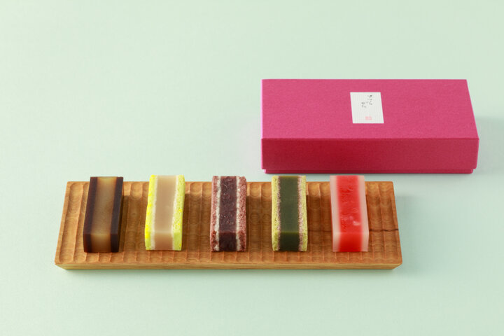 「ささらがた」は、名古屋で創業380年余を誇る老舗の御菓子所「両口屋是清」を代表する和菓子のひとつ。箱の中には、「大納言」「柚子」「抹茶」の3種の餡村雨(餡に砂糖と粉類を混ぜ蒸したもの)と、「黒糖」「紅つぶ」の2種の煉羊羹が入っていて、5つの異なる味わいが楽しめるようになっています。 ほろほろとした口溶けの餡村雨、みずみずしくなめらかな舌ざわりの煉羊羹ともに、色合いのグラデーションが美しく、味わう前に一度お皿に並べると、目でも楽しむことができますよ。