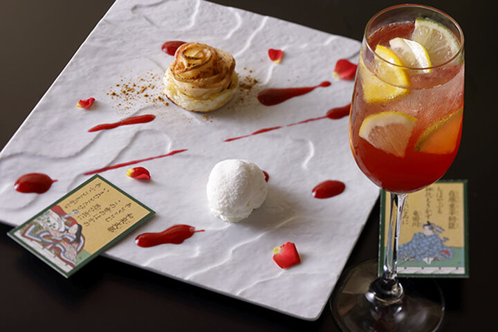 「あらざらむ この世のほかの 思ひ出に いまひとたびの あふこともがな」和泉式部 恋心をイメージして小さなバラの花のようなアップルパイに仕立てています。情熱を伝えるような温かいパイとひんやりとしたアイスのハーモニーを楽しんで。