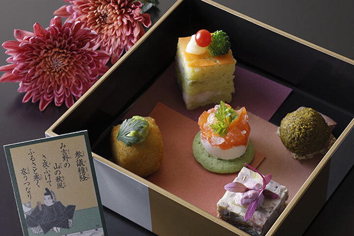 「みよしのの 山の秋風 さ夜ふけて ふるさと寒く 衣うつなり」参議雅経 「ふるさと」とはいにしえの都があった場所のこと。かつて大津京が置かれた滋賀県の美味しいものをぎゅっと詰めた、玉手箱のようなセイボリーが登場。近江牛や大マス、伊吹ハムの生ハムなどを使ったメニューを、一口サイズでいただけます。 予約方法など詳細は、公式サイトをご覧ください。 じっくりとスイーツやお茶を楽しみながら、秋の歌に思いをはせ、日常から解き放たれる時間を過ごしてくださいね。