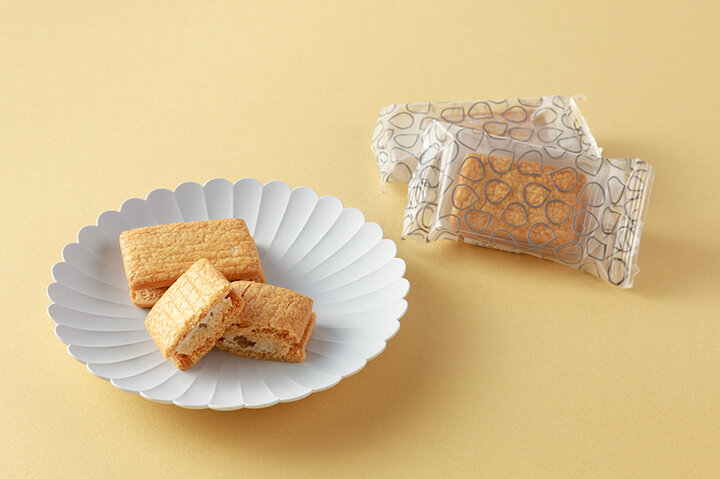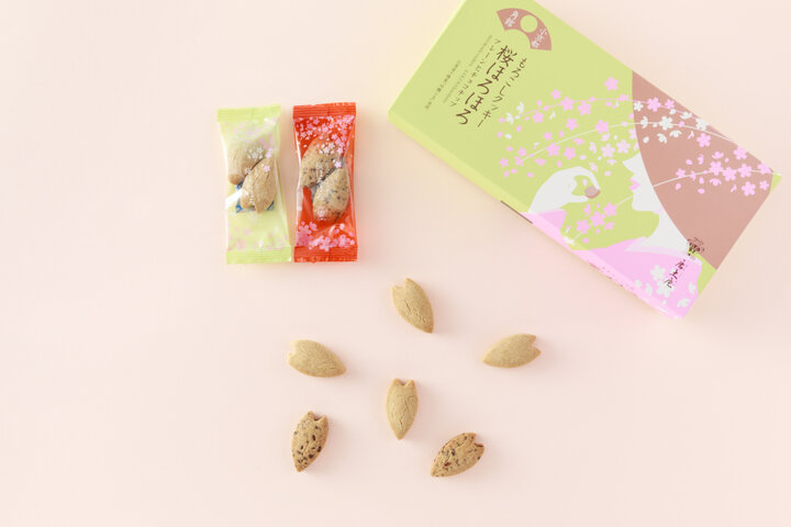たおやかな女性が描かれた、奥ゆかしいデザイン。箱のなかには、桜の花びらの形をした「もろこしクッキー桜ほろほろ」が並んでいます。2枚ずつ個包装になっているので、ティータイムでお茶に添えたり、友人へのおすそ分けにもぴったり。プレーンとチョコチップの2種類の味を楽しめます。 袋を開けると、もろこしと桜葉の香りがふわり。やさしくつまんで口に運べば、やわらかくサクサクとした食感のクッキーが、しっとりと口のなかでほどけていきます。チョコチップ味では、ほんのりとした桜葉の香りと一緒に、ビターなチョコレートの風味も楽しめますよ。
