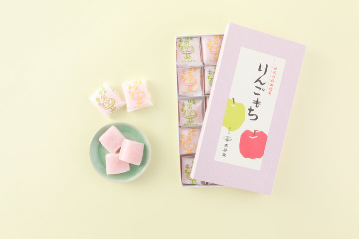 りんごが描かれた、どこか懐かしいデザイン。和紙のような手ざわりの箱の中には、素朴でレトロな包み紙からほんのり透けて見える、ピンク色のりんごもちが品よく並んでいます。ひとつ手に取ってみると、ふわふわとやわらかな感触。そっと包み紙を開いてみれば、四角いりんごもちが顔を出します。 ぱくっと口に放りこむと、りんごの甘酸っぱさが口いっぱいに広がります。大潟村産りんごの果汁が練り込んであり、香りがとても豊か。県産のもち米を使ったふにゃりとやわらかな食感の求肥は、ほどよい伸びがあり、とてもやさしい口当たりです。