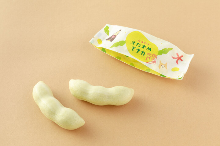 秋田犬やきりたんぽ、お杉わらべ。「おおだてえだまめもなか」のパッケージには、かわいらしい秋田の名物が描かれています。ふたを開けると、愛らしいイラストがプリントされた袋が6つ。袋を開けて枝豆の香りとともに顔を出したもなかは、まるで大きな枝豆のよう。さやのくぼみも細かく再現されています。 もなかを割ると、なかには白餡と枝豆を練った枝豆餡がぎっしりと詰まっています。ふわりと漂う枝豆の香りに誘われてまずはひと口。餡にはほどよい粘りがあり、なめらかな舌ざわりです。枝豆餡はコクのある枝豆と、やさしい甘みの白餡がちょうどよいバランス。もなかとともに舌の上でスッと溶けたあとも、枝豆の風味の余韻を楽しめますよ。