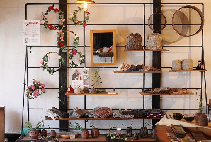 長谷川さんがセレクトするのは、お土産物ではなく、ここに暮らしているからこそ出会うことができた地元でものづくりに励む人々の作品。その中から気になるものをいくつかご紹介していきましょう。 まずは、毛糸作家「かなのいと」さんの編み物。糸から紡いで、染色もしているという毛糸はどれもぬくもり溢れる自然で優しい風合いです。ノールビルドニングという北欧に伝わる伝統的な技法で編んだ作品も作っていて、お店でワークショップを開催することもあるそう。手袋や帽子のほかアクセサリーなど、さまざまな作品を作っています。