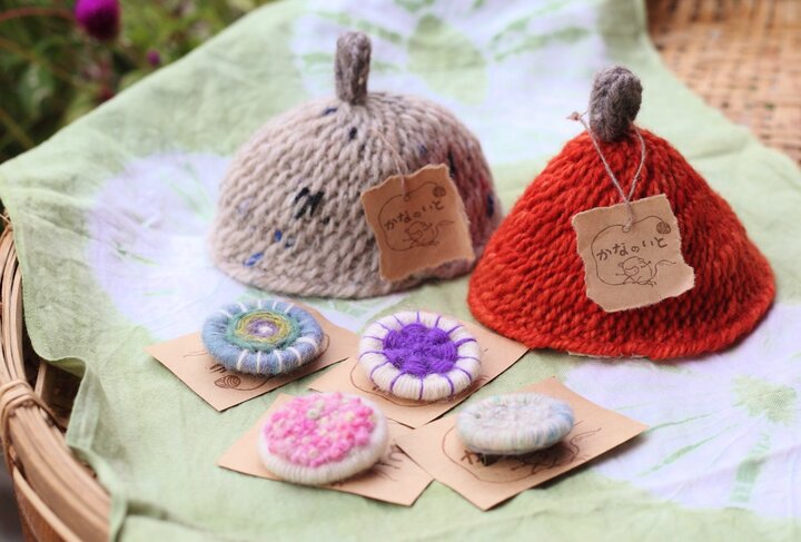 「かなのいと」の鍋つかみ(2000円)とブローチ(600円~)