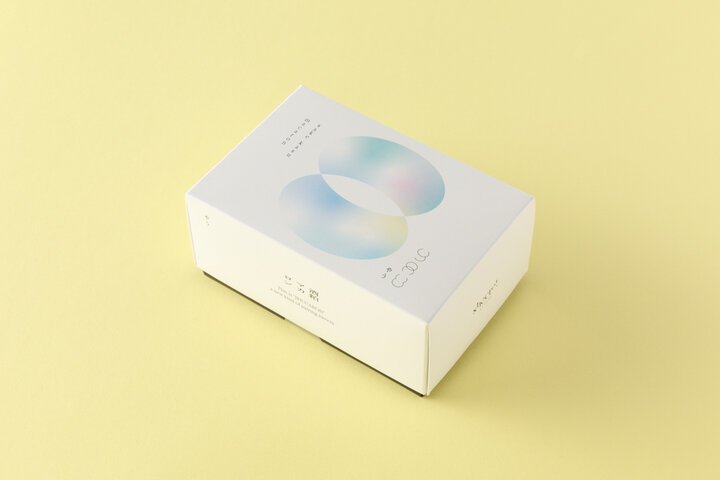 マカロンのかたちをイメージした家紋風ロゴのパッケージ。日本酒の酒粕のような瑞々しさや透明感、しだいに酔っていくさまを表現