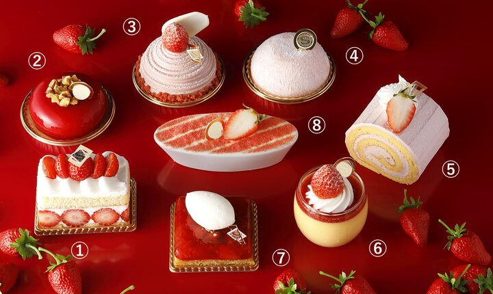 ①「ショートケーキ」は、本和香糖を生地と口どけの良い生クリームに使用。苺をふんだんに入れた贅沢なショートケーキです。 ②「ムース フレーズ エ ユズ」(伊勢丹新宿本店限定)は、苺ムースの中に柚子クリームを合わせ、さわやかに仕上げています。3種のナッツのトッピングがアクセントです。 ③「モンブラン フレーズ」(伊勢丹新宿本店限定)は、京都府産宇治抹茶を使用したムースのほろ苦さと、ジュレやシャンティショコラに使用した苺の甘さが絶妙です。 ④「オモチ ファルシー オ フレーズ」(伊勢丹新宿本店限定)は、甘酸っぱい苺ジュレ、トンカ豆の香るシャンティショコラ、やさしい甘さの本和香糖のスポンジを求肥で可愛く包んでいます。 このほか、軽やかな生地でミルキーな苺クリームを贅沢に包んだ⑤「苺のロールケーキ」、濃厚でなめらかな口どけの伝統のカスタードプリンに苺ソースを合わせた⑥「プディング オ フレーズ」(伊勢丹新宿本店限定)、甘酸っぱく香り豊かな3種の苺のみずみずしいケーキ⑦「キャレ ルージュ」や、なめらかなマスカルポーネクリーム、アールグレイと苺のシロップを染み込ませた生地を重ねたやさしい味わいの⑧「ティラミス オ フレーズ」(伊勢丹新宿本店限定)が登場します。 バラエティ豊かな“いちごを楽しむ”ケーキの数々を、ぜひ味わってくださいね。