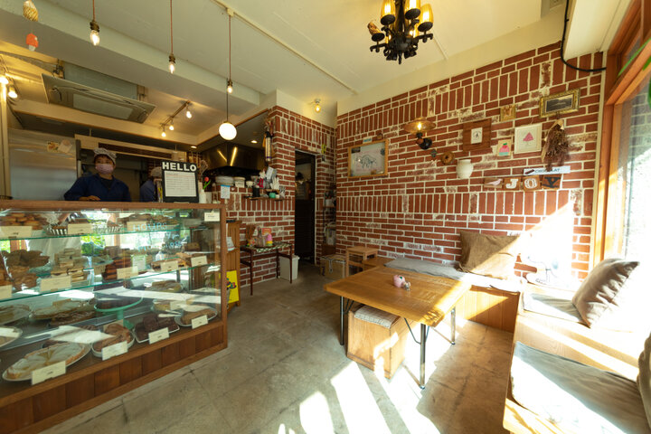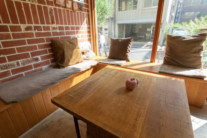 テーブルが一卓あり、イートインも可能。一面ガラス張りで自然光がたっぷり入る気持ちいい空間です。