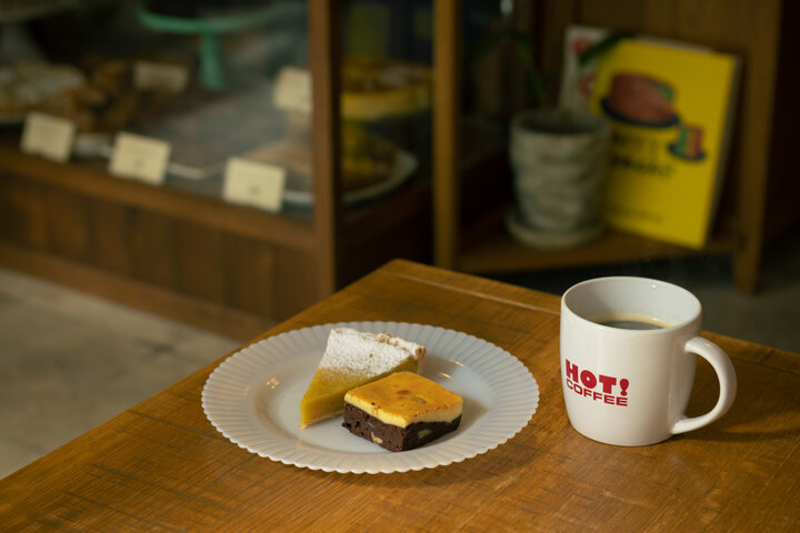 冬限定の「スイートポテト マーマレードパイ」は、ザクザク食感のクラスト生地にマーマレードを塗り、そのうえに紅はるかで作ったフィリングを重ねたもの。京丹後にある契約農家から仕入れた無農薬の紅はるかは、ホクホク加減としっとり感がお菓子にちょうどいいんだとか。中は濃厚、生地はあっさり、マーマレードの苦みがアクセントになった洋風スイートポテトです。 「ブラウニーボトムチーズケーキ」は今季のイチオシ。下がピーカンナッツ入りのブラウニー、上がレモンのコンフィを加えたベイクドチーズケーキです。ブラウニーはどっしり重量感はあるけど甘すぎず、濃厚なチーズケーキと絶妙なハーモニー。スクエア型のビジュアルがかわいい人気商品です。 コーヒーは大阪・新町にある「メルコーヒーロースターズ」にオーダーしたオリジナルブレンド。ケニアの浅煎りとコロンビアの中深煎りのブレンドは、クリアな味わいで焼き菓子との相性抜群です。
