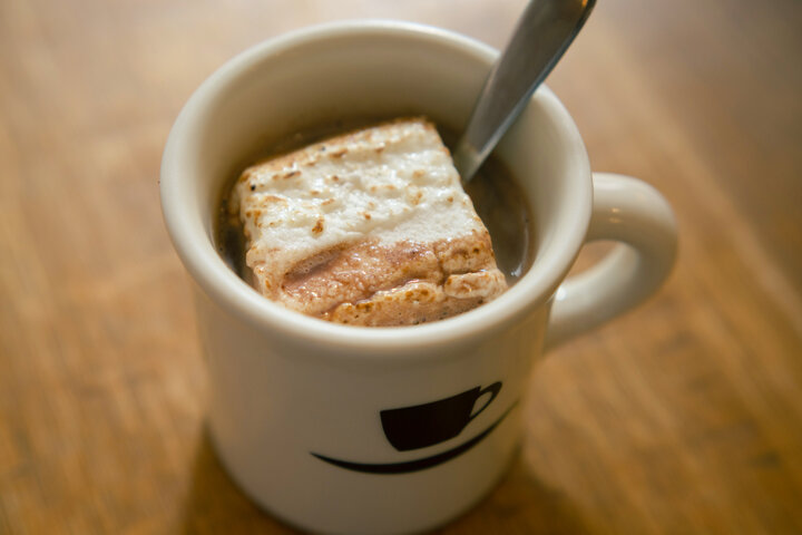 冬限定のドリンクとして人気なのが、ビターチョコレートをミルクで溶かしたホットチョコレート。ニューヨークで飲んで感動したホットチョコレートを再現したそうで、オレンジのリキュールで香りづけ。ドドンと大きい手作りマシュマロをトッピングしています。