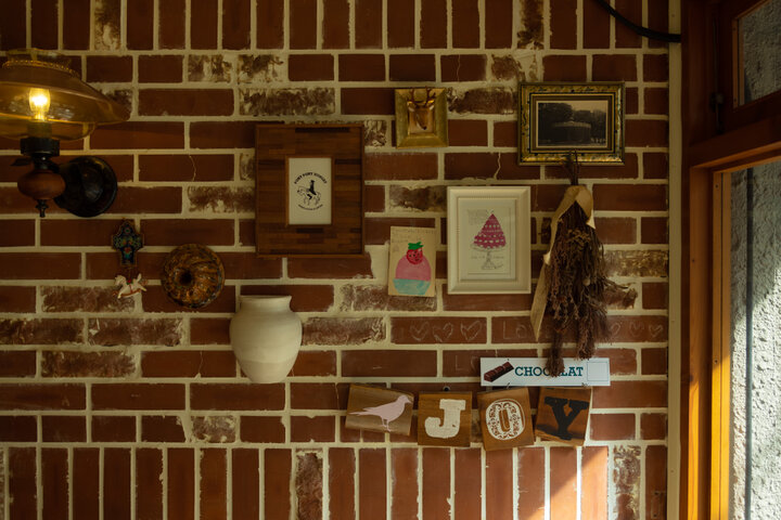 インテリアはヨーロッパやアメリカのアンティークを中心に、いただきものをそのまま飾ることも。小さなお子さんのお客さんからいただいた手紙やイラストレーターが描いたイラストなどをセンス良く飾っています。