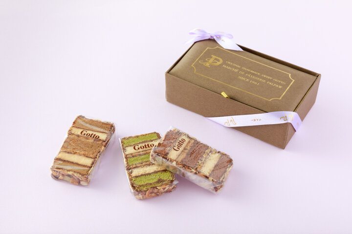 茶色のシックな化粧箱に結ばれているのは、淡いピンク色をした品のいいリボン。ふたについた金色のつまみを持ち上げると、茶色や抹茶色の生地に白いボーダーが入ったスイーツ「スイートゴット」が入っています。 パイやサブレはサクサクと、スポンジはしっとり、折り重なった層が口にしたところからほろほろと崩れる食感や、練り込まれたコーヒーや抹茶、チョコレートの味と香りの広がりなどを五感で楽しむことができます。甘みに使っているのは、天然の甘味料てんさい糖です。そのため、まろやかな甘さで体にやさしいスイーツに仕上がっています。 季節限定フレーバーや20、30、50個入りのギフトにぴったりな商品も用意されていますよ。