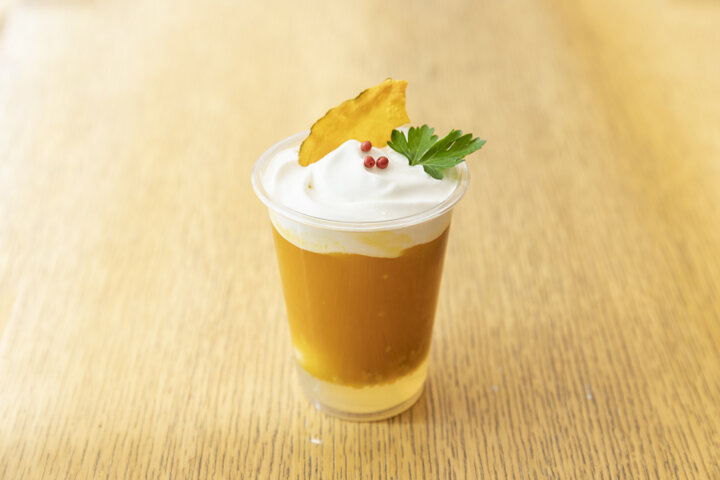 「すりながしスタンド だしとうまみ」を手がけるのは、同じく「京都ハンディクラフトセンター」内にある京料理のお店「匠 正阿弥(たくみしょうあみ)」。料理長が近年流行しているタピオカドリンクに着想を得て、「手軽に楽しみながらも、体に良いものを」という思いから、和の素材や技法を使ったメニューが生まれました。 お店で味わえるのは、かぼちゃなど旬の野菜をすりつぶし、だしと合わせた和風のスープ「すりながし」。若い世代の人たちにも楽しんでもらえるよう、スイーツのようなかわいらしい見た目にアレンジされています。