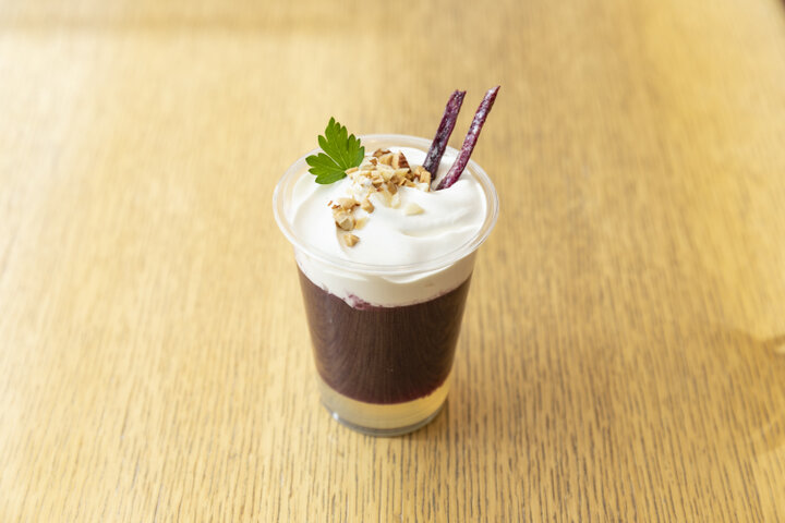 紫芋のすりながしも中に白玉や近江こんにゃくが入っており、上にはナッツをトッピング。甘さ控えめで、さっぱりとした飲み心地です。ワンハンドで気軽に味わえて、1杯でお腹が満たされるので、仕事の合間や小腹が空いたときにもおすすめ。 すりながしのメニューは、季節によって変わります。冬には、肌寒い日にぴったりな温かいすりながしも登場します。