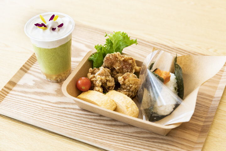 お好みのすりながしと、おにぎりや出し巻き卵、おかずが入ったお弁当のセットも。大きな具材が贅沢なおにぎりは、鮭とたらこの2種から、料理人の腕が光るおかずは、唐揚げ、鶏の塩こうじ焼き、カラフルなあられをまぶした鯛の五色揚げの3種から選ぶことができます。ランチなどしっかりと食べたいというときにおすすめです。 おにぎりやおかずのほかに、食後のデザートにぴったりなプリンもあります。それぞれ単品でも購入できるので、自由な組み合わせで楽しめますよ。